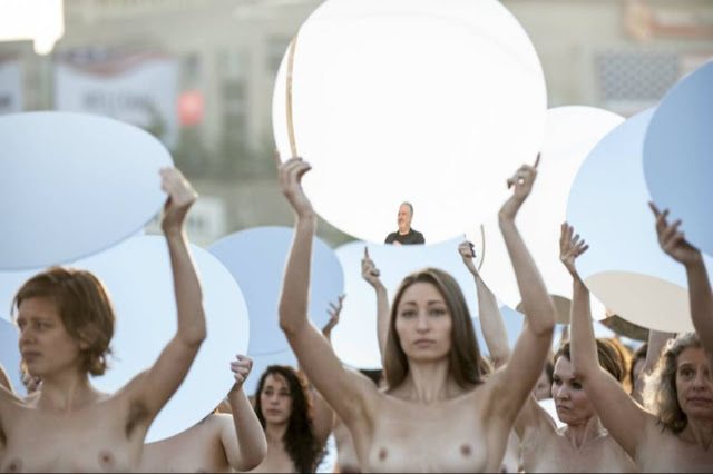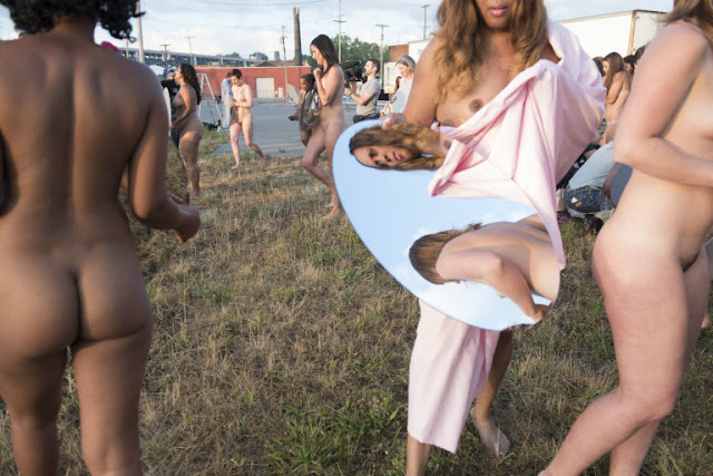 So, in protest of the sexism perpetuated by Trump and others, artist and photographer Spencer Tunick organized the display of 100 nude women holding large round mirrors that shined light on the arena where the convention is taking place. The installation was originally planned out in May with a casting call, and more than 1,800 women applied to pose nude for the shoot.