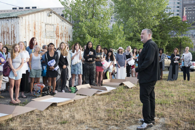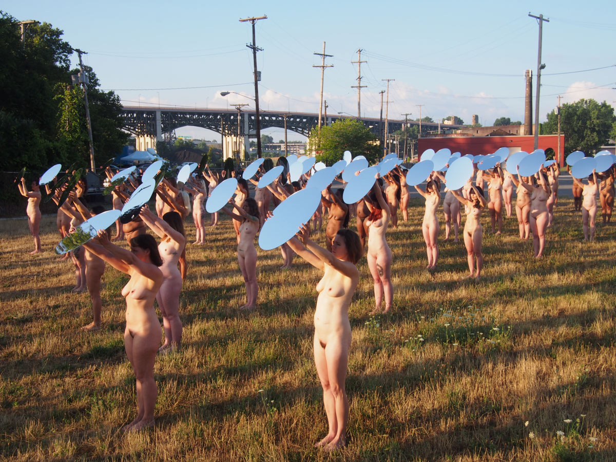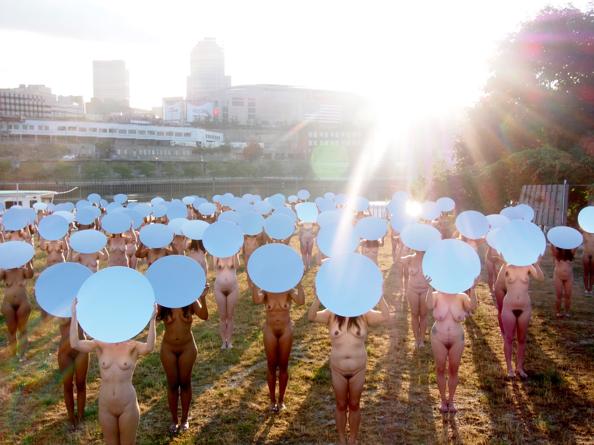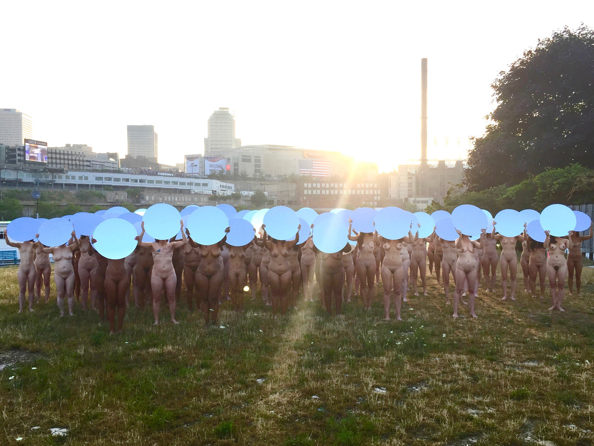 So, in protest of the sexism perpetuated by Trump and others, artist and photographer Spencer Tunick organized the display of 100 nude women holding large round mirrors that shined light on the arena where the convention is taking place. The installation was originally planned out in May with a casting call, and more than 1,800 women applied to pose nude for the shoot.