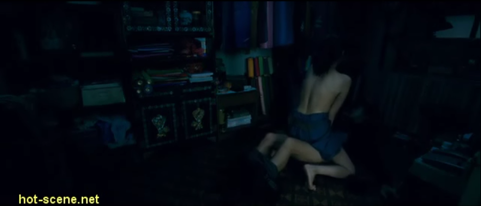 Ok-bin Kim lying on her back as a guy pulls down her blue dress to expose her breasts. The guy then kisses her breasts and removes her dress entirely so that he can have sex with her. From Thirst.